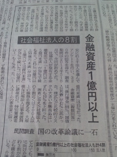 今日の朝刊で社会福祉法人の80%が1億円以上の金融資産を保有していると大々的に報道されていますが、根底にあるのは保育や介護サービスを事業として行っている民間企業と社会福祉法人との間に税金面での優遇や公金からの補助など様々な不公平感や不満が民間企業側にあるようです。