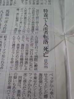 本日の読売朝刊によると26日午前11時ごろ特別養護老人ホーム「ひのでホーム」にて入居者をベッドから車椅子への介護の際に転落し頭部を打って病院に搬送され死亡したようです。